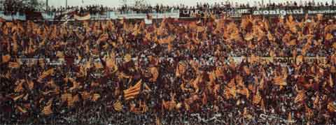 転換期を迎えている政治とバルサの密接な関係が見られるこの時期である。それを最も象徴的にあらわしたのが、20年にわたって亡命生活をおくっていたカタルーニャ州首相が帰国してきたときのことであった。 1977年10月30日、カンプノウではラス・パルマス戦がおこなわれる。この試合には長い亡命生活を終えてバルセロナに戻ってきた、タラデーラス・カタルーニャ首相が試合観戦に来ることが予定されていた。カンプノウはもちろん満員となっている。そしてジョアン・グラナードスは、この日のために横幅20メートルは優にあるカタルーニャ旗を密かに用意していた。バルサの会長アグスティ・モンタルとタラデーラス首相は、10万観衆のスタンディングオベーションと拍手を受けて貴賓席に登場した。と同時にグランド内を巨大なカタルーニャ旗を持った青年が走り回る。そして観客席のあらゆるところに「お帰りなさい、首相!」という垂れ幕があらわれた。 会長のアグスティ・モンタルが挨拶に立つ。 1977年6月には、内戦以来の初の総選挙がスペインでおこなわれていた。民主主義時代への移行となる第一歩だ。その総選挙に立候補した政党数が、実に157にものぼったといわれている。ほとんどの政党が2、3人の構成者で立ち上げられた小さい政党。一つの政党構成員がすべてタクシー1台に乗れるところから「タクシー政党」とまで呼ばれた。 そしてバルサの会長選挙も、クラブ創立以来初の一般ソシオの投票による選挙となる。時代は再び動き始めた。 |