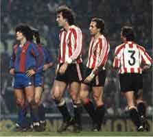 ![]() マラドーナ2年目となる83−84のシーズンは、1983年9月24日第4節を迎えていた。前シーズンのチャンピオンであるビルバオを迎えてのカンプノウでの試合。ビルバオの監督はハビエル・クラメンテだ。 対照的な2人の監督である。選手個人の才能と創造性を大切にし、各選手の自由な発想のもとにチーム総体としてのブロック作りが理想的とするメノッティ。対して、選手1人1人が相手の創造性を破壊する駒であり、非常に肉体的な激しいフットボールを信条とするクレメンテ。メノッティからビルバオを見れば「恐ろしくも暴力的」なフットボールであり、クレメンテからバルサを眺めると「お嬢さん」フットボールであった。したがって試合がおこなわれるまでの1週間、それぞれの監督による壮絶な舌戦が繰り広げられたのも不思議なことではない。 試合開始と共にバルサは圧倒的なボール支配を見せ、ペリーコ・アロンソとフーリオ・アルベルトの得点により前半を楽に終了した。誰の目から見てもバルサ圧勝という雰囲気を感じさせる試合展開の前半だった。だが後半12分、シュステルに昨シーズン大けがをさせたゴイコエチェア(2001−02シーズン開始当初のラージョの監督)が、再びその暴力性をむき出しにしたプレーをする。今度の犠牲者はマラドーナだった。ボールを持ったマラドーナに対し、後ろからのゴイコエチェアの「恐ろしくとも暴力的な」タックルが決まる。その後、スペインフットボール史において「最も暴力的なタックル」と呼ばれることになるファールであった。また、イギリスのメディア向けにスペインでフリーランサーとして働くエドワード・オーエンが、このゴイコエチェアのプレーを見て「ビルバオの屠殺人」というあだ名をつけて有名になったプレーでもある。