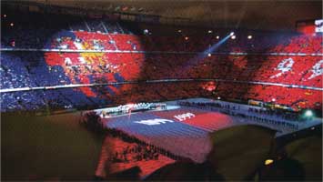 ![]() 私、カンス・カンペルはバルセロナにてフットボールのチームを作りたいと思います。このスポーツに興味のある方は、火曜か金曜の21時〜23時の間に連絡をください。 カタルーニャ名としてジョアン・ガンペルと自ら名付けたこのスイス人によって、このような呼びかけが“ロス・デポルテス”紙に掲載されたのが1899年、そしてそれからすでに100年経過し今は1998年。彼がこの世に誕生させたバルサというクラブは10万人以上のソシオと10万人収容のカンプノウ・スタディアムを擁し、世界最大のフットボールクラブの一つとして知られるようになっている。それも他の多くのクラブと比較して非常に“特殊”なクラブとしてフットボールファンに知られている。 1998年11月29日21時、カンプノウは異様な雰囲気に包まれていた。10万人のバルセロニスタが観客席を埋め尽くしているカンプノウ、だがスタディアムの照明は落とされ真っ暗闇に包まれている。そしてクラブ会長のヌニェスと国王次女のインファンタ・クリスティーナの二人がパルコの席についたその瞬間、セレモニーの開始を告げるオープニング音楽と共に、とてつもなく明るいレーザー光線がカンプノウスタディアムを照らしはじめた。待ちに待ったクラブ創立百周年記念セレモニーの開幕だ。レーザー光線によって照らしだされたグランドでは各種の催し物、それはかつてバルサに在籍した選手たちの行進や、多くのバルサセクションの選手たちの行進、そしてこの日のためにバルセロナにかけつけた世界各地に点在するバルサファンクラブの人々の行進などが続く。バルサというクラブの“オーナー”である10万ソシオも観客席からこのスペクタクルを眺めているだけではなかった。彼らもまたこのフィエスタに参加すべく、巨大なモザイク模様のアスールグラーナカラーを観客席に作り出していた。 30分以上続いたこの百周年記念セレモニーのハイライト、それはジョアン・マヌエル・セラーがグランドの真ん中に登場しバルサイムノを歌う瞬間だった。バルサイムノ、それはバルサの試合には絶対に欠かせないものだ。そしてこの日も大事な主役の一つとなったバルサイムノ。そのイムノを歌うのが「生まれた時からバルセロニスタ」と自称する、カタルーニャが生んだ最大の歌手であるセラーだ。クライフ派を自称する彼はこのセレモニーを前にしてこう語っている。 ジョアン・マヌエル・セラー、フランコ独裁政権時代に反体制歌手として各ステージでメッセージソングを歌い続けただけではなく、街頭での反体制デモにも参加する行動的な歌手として知られていた。特にフランコ独裁政治から逃れ中南米へと移民生活を強いられた人々にメッセージを送るために、何回もアルゼンチンなどでコンサート活動を続け、中南米ではすでに抵抗詩人歌手として有名となっていた歌い手でもある。またフェスティバル・ユーロビジョンというヨーロッパ各国を代表する歌手が集まっておこなうフェスティバルでも、カタラン語で歌うことを禁止したフランコに抵抗し、出場を辞退したことでも知られている。その彼がクラブ百周年セレモニーでイムノを歌うのは、クラブの歴史的性格からしてごく自然なことであり象徴的なことでもあった。